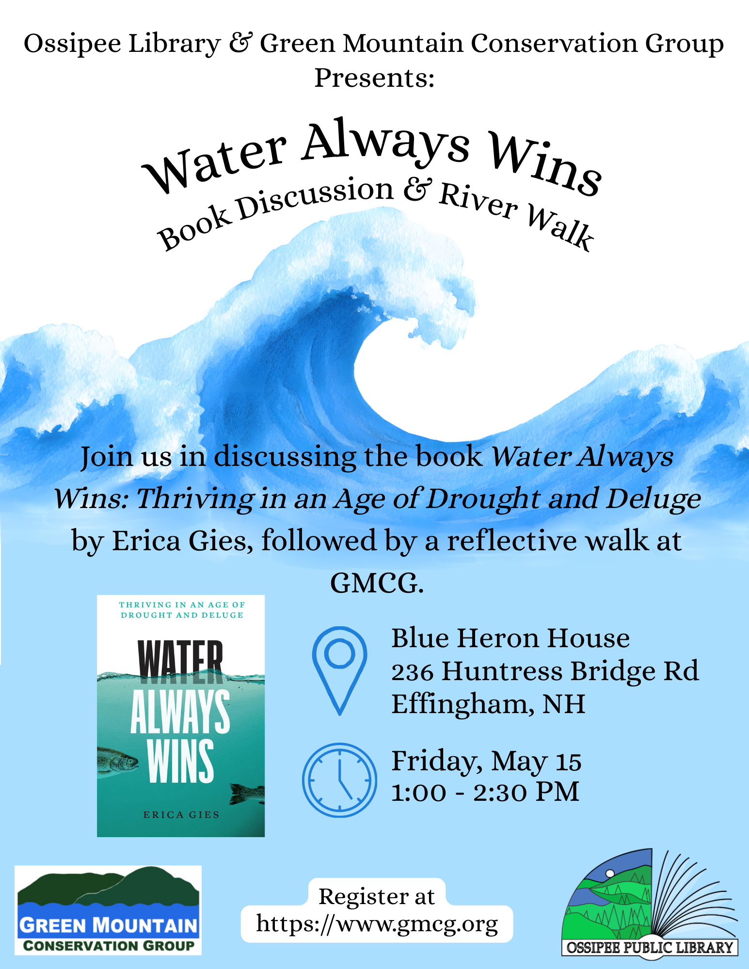 Friday, May 15 from 1:00 p.m. to 2:30 p.m. Water Always Wins: Thriving in an Age of Drought and Deluge by Erica Gies Book Discussion & River Walk: Join Ossipee Public Library and Green Mountain Conservation Group at GMCG’s Blue Heron House for a discussion of the award-winning book Water Always Wins: Thriving in an Age of Drought and Deluge by Erica Gies, followed by a guided nature walk. Winner of the Rachel Carson Award for Excellence in Environmental Journalism, Water Always Wins takes us on a journey across the globe, highlighting sustainable practices of living with water from the past and present that can inform our future. Following the discussion, we will embark on a journey of our own with a guided walk along the Ossipee River where participants can journal, reflect, and share their thoughts with others. Copies of the book are available at the Ossipee Public Library and other local libraries.