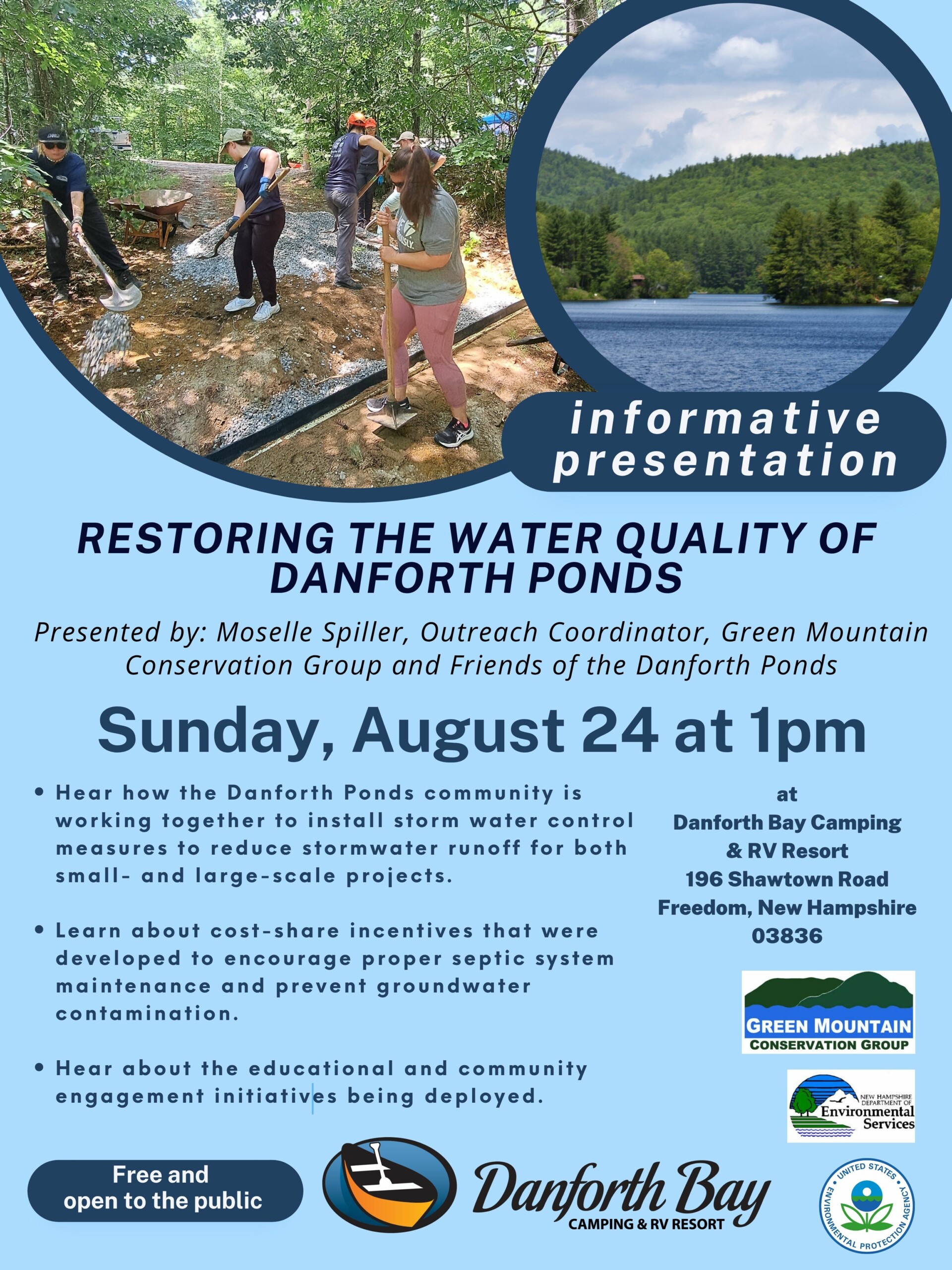 On Sunday, August, 24th at 1 pm at the Danforth Bay Campground, join us for a presentation on Restoring the Water Quality of Danforth Ponds presented by Moselle Spiller of the Green Mountain Conservation Group. The presentation is an enlightening depiction of all projects that have been completed with the grant funding earmarked for Danforth Ponds by the EPA.. It will also cover two ongoing projects, proposed stormwater control measures to be installed on Ossipee Lake Road and the septic awareness incentives still available for Danforth Pond waterfront homeowners. Previously presented at the New Hampshire Lakes Congress in June.
